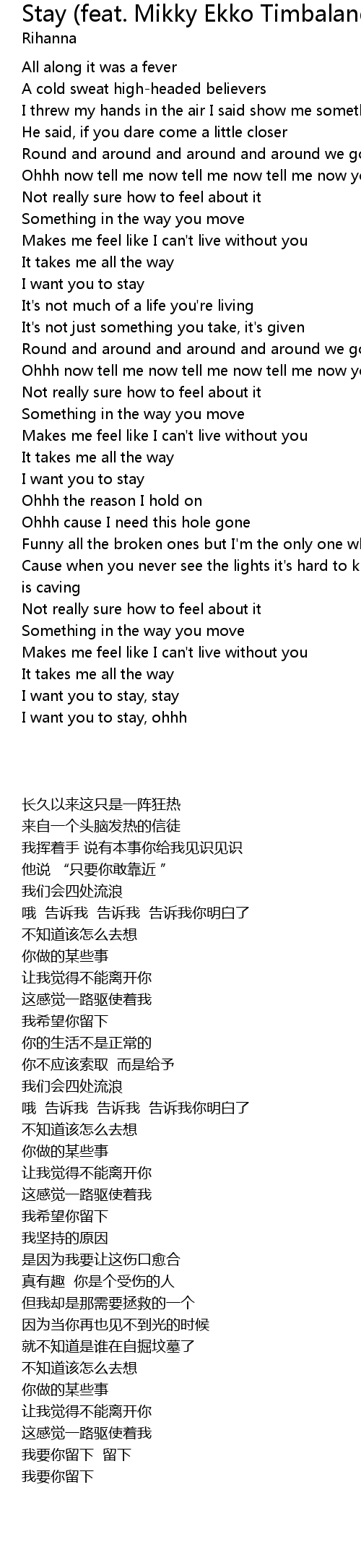 , Solo version of "Stay" by Rihanna.. "Stay - rihanna ft mikky ekko (lyrics)", . If you're searching for Stay Rihanna Lyrics theme, Rihanna ft Mikky Ekko Stay Lyric Video, Rihanna Stay Unapologetic Def Jam Recordings @XIXVMusic Buy Unapologetic Here: . you have visit the ideal site. Our web always gives you hints for seeing the highest quality pics content, please kindly hunt and locate more enlightening articles and images that fit your interests.